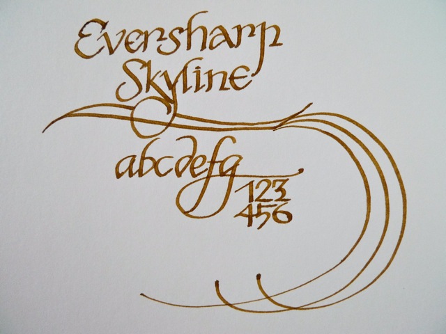 I thought it would be of interest to show the backs of two Eversharp Skylines. To the left is an unmodified pen. As you can see, Greg’s pulled up both the nib and the feed to make his music hack work.