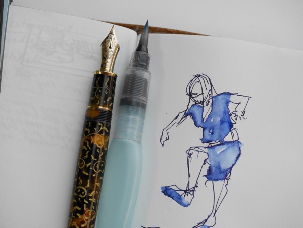Waterbrushes – brushes whose handles hold water – have made it possible for travelers and commuters to sketch and wash on the go with hardly any mess or fuss. Fountain pen doodlers will find that a waterbrush or two in the bag can extend their enjoyment, adding wash to their line work.
