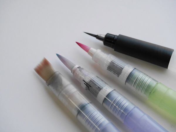 Waterbrushes come in several tip sizes and under many brand names. I am most familiar with the Pentel Aquash. It comes in broad, medium, and fine tips, as well as a portable size with a shorter handle. Other brands are Holbein, Zig, even Derwent. The chisel style lends itself very well to calligraphy.